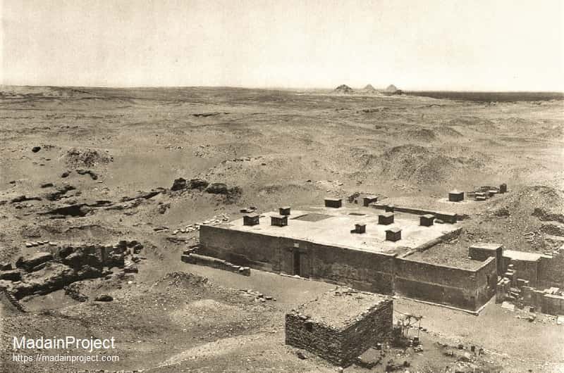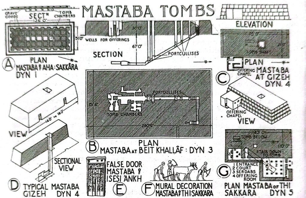 By the first Dynasty, the more elaborated graves had come to simulate house plans of several small rooms, a central one containing the sarcophagus and others surrounding it to receive the abundant funerary offerings. The whole was constructed in a board pit below ground and the wooden roof being supported by timber posts or crude brick pillars and the entire area covered by a rectangular flat -topped mound of the spoil from excavation, retained in place by very thick brick walls. The outer faces were either serrated with alternate buttress like projections and narrow recess which is called ‘Palace Facade’ arrangement and sloped backwards at an angle of about 75 degrees. Such tombs now-a-days are known as MASTABA’s.