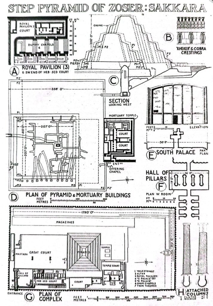 The pyramid itself shows no less than five changes in the course of its construction period. It started as a basic MASTABA with a 26ft height with a base of a square shaped plan with 207ft of sides. After that it was extended twice. At first the additional 14ft height to each of the sloping sides and next by an extension on the Eastwards by 28ft. At this stage the whole was used as a basis for a four-stepped pyramid, made up of layers inclined against a steeped slide core and again enlarged at the same time so that its plan became a rectangle of about 272ft by 244ft. A further enormous addition on the North and West followed by a quite slight one all round, brought it to its final dimension of 411ft from East to West, by 358ft wide and 200ft high. Adding these steps to the height makes it a six stepped tomb. Usually the underground chambers were built before the superstructure was made but in this case a pit of 24ft side and 28ft deep was the counterpart of the first Mastaba, approached by a horizontal tunnel emerging at the North side in an open ramp;but this pit was deepened to 92ft at the pyramid stage of development and had an Aswan Granite tomb chamber at the bottom above which was a limestone-walled room containing a granite plug to stop a hole at the top of the tomb-chamber when the burial had been completed. The second tunnel is 70ft deep. From the bottom of the pit four corridors extended towards the four cardinal points, connecting to galleries running in approximately parallel with the four sides of the pyramid. Independent from the main system there are eleven separate pits 106ft deep on the East side of the original mastaba. These were the tombs of Royal families. The doorways were sealed by the Third extension of the Mastaba.