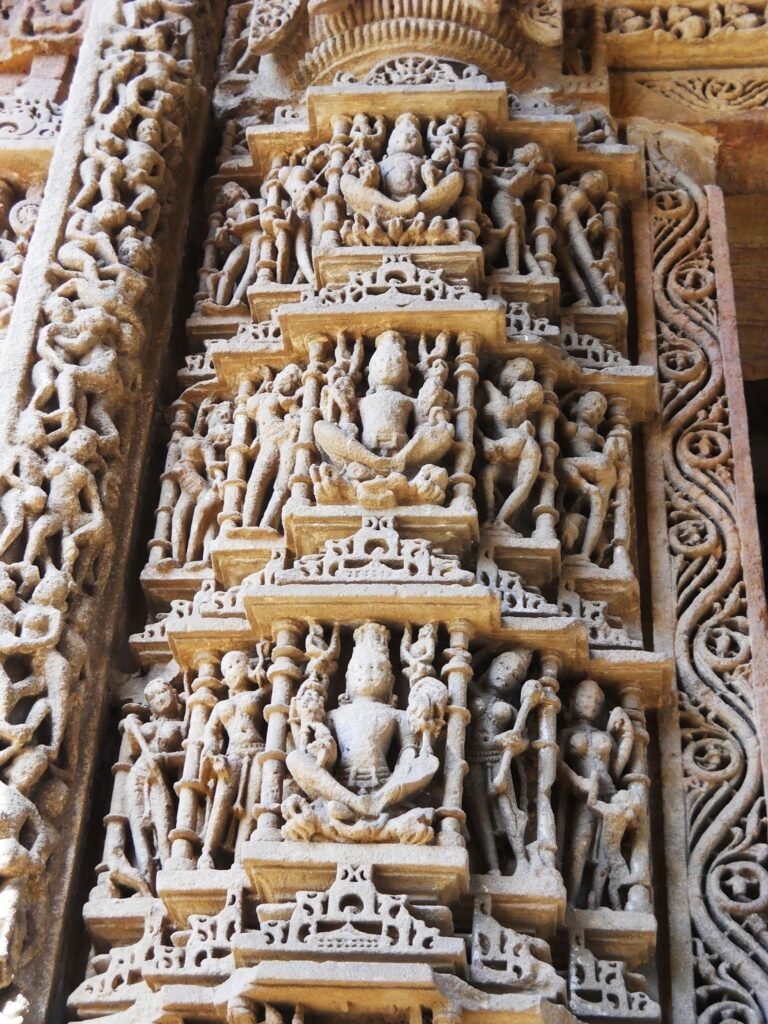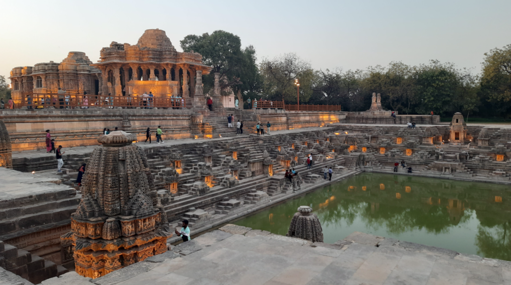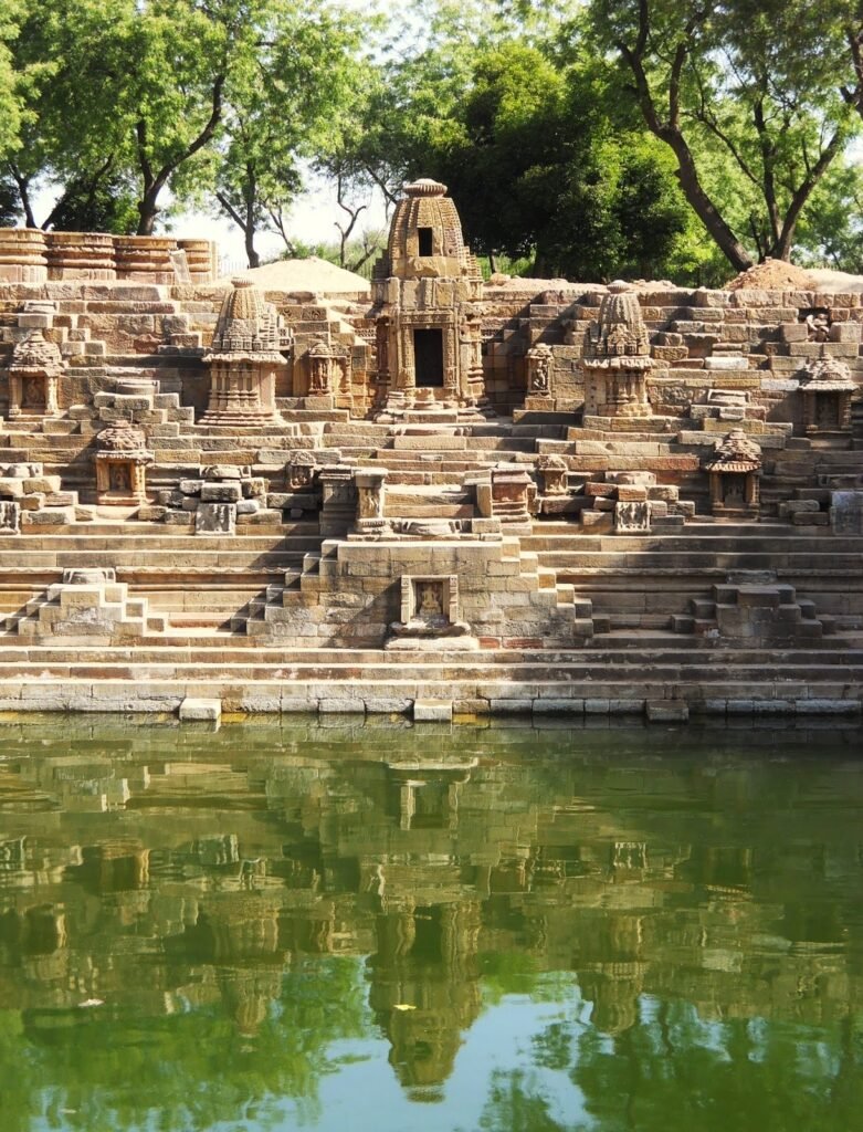 The Surya Kund in Modhera, northern Gujarat, next to the Sun Temple, built by King Bhima I in 1026 to honour the sun god Surya. It’s actually a tank (kund means reservoir or pond) rather than a well, but displays the hallmarks of stepwell architecture, including four sides of steps that descend to the bottom in a stunning geometrical formation. The terraces house 108 small, intricately carved shrines between the sets of steps. The magnificent tiered reservoir of the Sun Temple at Modhera. This kundh was more than just a water tank; it was an integral part of a bigger complex of scientific and religious edifices oriented toward Surya, the Sun God. Totally carved out of sandstone, Suriya Kundh is a reflection of the Rajput era’s mastery over astronomy, geometry, climate, and ritual skillfully brought together into architectural form.