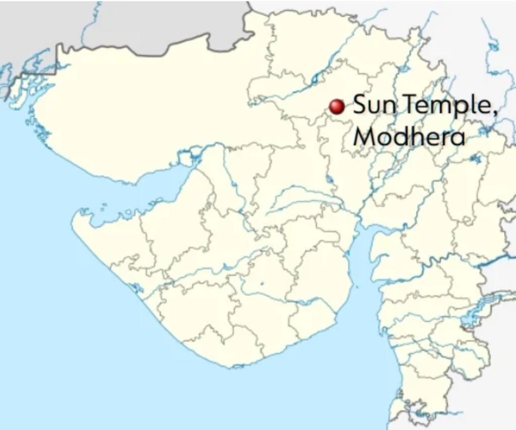 Modhera is located in Gujarat, where it can be found today. It is 32 kilometers away from Patan. Once, Patan served as the capital of the Chaulukya Dynasty, which is also referred to as the Solanki Dynasty. The Modhera temple complex is located at 23.6° north latitude, placing it in proximity to the Tropic of Cancer. This matters as it influences the way the sun’s rays strike the Modhera temple. The solar alignment of the Modhera temples is uniquely remarkable.