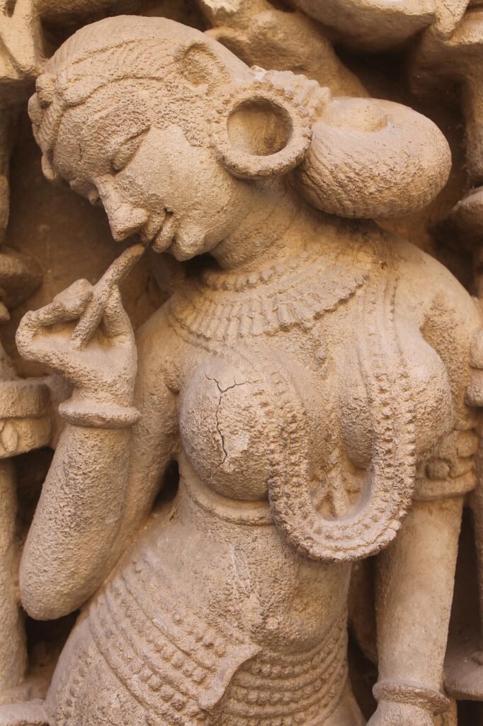 Among the magnificent sculptures, a female form stands out. This aesthetic is clearly inspired by Shringer, the art and aesthetic of beautification. This art form of femininity has been celebrated by Indians for centuries. A Woman arches her back with sensual grace, another color her lips. Beauty and sensuality have been frozen in time